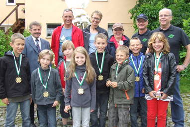 Hintere Reihe von links: Zweiter Bürgermeister Matthias Wenzel, Robert und Rike Thürich, Carmen Hodel vom RC Pfeil Hof, WSV-Vorsitzender Werner Bayer und sein Vertreter Günter Gebelein; vordere Reihe von links: Tim Baier, Noah Oelschlegel, der Jüngste Franz Rank, Elisa Oelschlegel, Noah Baier, Noah Hoffmann, Marvin Hoffmann und Alina Aupelt.