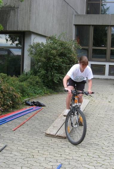 Sarah beim Geschicklichkeitstraining auf dem MTB-Parcour